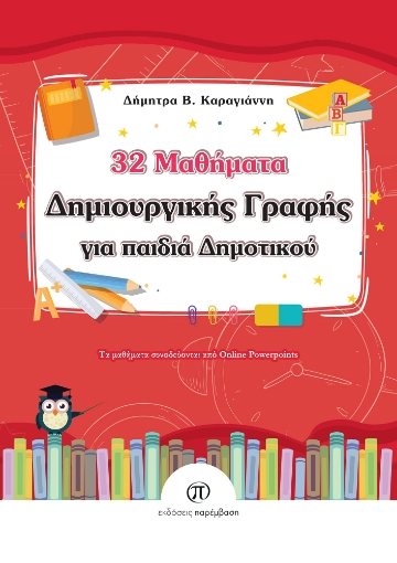 Τα «32 Μαθήματα Δημιουργικής Γραφής για παιδιά Δημοτικού» είναι ένα εκπαιδευτικό βιβλίο που στόχο έχει να βοηθήσει τους μαθητές να ασκηθούν στον μαγικό κόσμο της γραφής, μέσα από ευφάνταστες και δημιουργικές δραστηριότητες, στο πλαίσιο της δημιουργικής γραφής. Μέσα από τις 32 ενότητές του παρέχονται ολοκληρωμένα μαθήματα, αποτελώντας παράλληλα πολύτιμο εργαλείο για τον εκπαιδευτικό, που εξοικειώνουν τα παιδιά με τη συγγραφή, με σπουδαία έργα της παγκόσμιας και ξένης λογοτεχνίας, αλλά και της μουσικής & της ζωγραφικής, ενώ υπάρχουν και πιο κλασικά θέματα διδασκαλίας που συναπαρτίζουν τη θεματική του. Τα online Powerpoints, που συνοδεύουν πολλές από τις ενότητες, οπτικοποιώντας πολλές από τις ιστορίες και παρέχοντας χρήσιμο συνοδευτικό υλικό, προσελκύουν την προσοχή των παιδιών, μεταδίδοντάς τους με έναν πιο αποτελεσματικό τρόπο τα διάφορα μηνύματα.