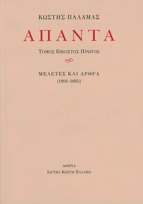 Κυκλοφορεί στη νέα πλήρη φιλολογική έκδοση Απάντων του Κωστή Παλαμά ο εικοστός πρώτος τόμος τους [Μελέτες και άρθρα (1891-1895)], ο οποίος απαρτίζεται από κείμενα που δημοσιεύονται την περίοδο 1891-1895 στην εφημερίδα Εφημερίς και στο περιοδικό Εστία, ενώ περιλαμβάνονται και πέντε λήμματα από το Λεξικόν Εγκυκλοπαιδικόν των Μπαρτ και Χίρστ, καθώς και μία συνέντευξη του ποιητή στον Δημήτριο Χατζόπουλο (Μποέμ) για την εφημερίδα Το Άστυ...