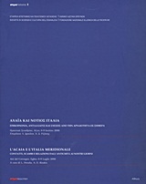 Το Ελληνο-ιταλικό Συνέδριο με θέμα: "Αχαΐα και Νότιος Ιταλία: επικοινωνία, ανταλλαγές και σχέσεις από την αρχαιότητα, ως σήμερα" διοργανώθηκε από τις 6 έως τις 9 Ιουλίου 2006 από την Εταιρεία Επιστήμης και Πολιτισμού Αιγιαλείας (ΕΤ.Η.Π.Α) σε συνεργασία με την Ιταλική Αρχαιολογική Σχολή της Αθήνας, στον χώρο του Πολιτιστικού Κέντρου του Αιγίου, υπό την Αιγίδα του οικείου Δήμου. Ο ανά χείρας τόμος αποτελεί τα Πρακτικά του Συνεδρίου αυτού του οποίου ο κύριος στόχος ήταν η διερεύνηση της μακραίωνης ιστορίας της περιοχής, στενά συνυφασμένης με το φαινόμενο της μαρτυρημένης μετακίνησης και εγκατάστασης πληθυσμών και στις δύο πλευρές του Ιονίου πελάγους, από τον 8ο αιώνα π.Χ. Η επιτυχία του εγχειρήματος οφείλεται πρωτίστως στις εξαιρετικές ανακοινώσεις που παρουσιάστηκαν κατά την διάρκεια των εργασιών από μελετητές της Αρχαιότητας, του Μεσαίωνα και των Νεότερων Χρόνων και προσέφεραν μια διαχρονική και διεπιστημονική προσέγγιση των σχέσεων και επαφών των δύο περιοχών. Θα πρέπει να προστεθεί εδώ ότι οι εργασίες του Ελληνο-ιταλικού Συνεδρίου συνδιοργανώθηκαν με τις εκδηλώσεις αδελφοποίησης της πόλης του Αιγίου με την ιταλική πόλη Capaccio της Κάτω Ιταλίας (αρχαία Ποσειδωνία) και ενισχύθηκαν οικονομικά από τον Δήμο Αιγίου με την πρωτοβουλία του τότε Δημάρχου κ. Γ. Περπή και τη σύμφωνη γνώμη του Δημοτικού Συμβουλίου, τους οποίους ευχαριστούμε θερμά από τη θέση αυτή. [...] (από το προλογικό σημείωμα του βιβλίου) Περιλαμβάνονται τα κείμενα: Εισαγωγικές μελέτες - Αθανάσιος Δ. Ριζάκης, "Ταξιδεύοντας στην Εσπερία: ανάμεσα στην ουτοπία, τον μύθο και την πραγματικότητα" - Mario Lombardo, "Οι Αχαϊκές αποικίες στην Ιταλία. Πηγές και ιστοριογραφικά προβλήματα" - Ευάγγελος Χρυσός, "Το Ιόνιο Πέλαγος, γέφυρα Ανατολής και Δύσης" Αρχαιότητα: Επικοινωνία, ανταλλαγές και σχέσεις - Μιχάλης Πετρόπουλος, "Οι αχαϊκές μητροπόλεις των αποικιών της Μεγάλης Ελλάδας" - Gregorio Aversa, "Kroton e la madrepatria: elementi di conformita o divergenze?" - Maria - Tereza Iannelli, "Caulonia: dalla fondazione al tramonto della citta antica" - Marina Cipriani, "Poseidonia: citta e territorio dalla fondazione alia meta del V sec. a.C" - Irene Campolo, Francesco Antonio Cuteri, "Loia ce pramata: ti meni acomi an ta palea chronia stin meria greca tis Calavria. "Worter und Sachen", angionimi e vasi: testimonialize archeologiche e lessicali nell area greco-calabra" - Αναστασία Γκαδόλου, "Εξάπλωση των Αχαϊκών εργαστηρίων κεραμεικής στην Αχαΐα και τη Νότιο Ιταλία στη διάρκεια της Ύστερης Γεωμετρικής και Πρώιμης Αρχαϊκής περιόδου" - Ερωφίλη - Ίρις Κόλλια, "Η λατρεία του Μίθρα στο Αίγιο" Μεσαίωνας: Για ένα δυτικό Βυζάντιο - Θεώνη Κολλυροπούλου, "Η λαμπρή υμνογραφική παράδοση της Κάτω Ιταλίας και της Σικελίας: Προκόπιος Κρυπτοφέρρης, ένας ελάχιστα γνωστός υμνογράφος" - Άννα Ι. Λαμπροπούλου, Αφέντρα Γ. Μουτζάλη, "Η μετοικία των κατοίκων της Πάτρας στο Ρήγιο της Καλαβρίας (τέλη 6ου-αρχές 9ου αιώνα). Η αναίρεση μιας μαρτυρίας;" - Angeliki Tzavara, "Quandam bonam terrarn que dicitur Posticza: Vostitsa latina, seconda meta del XlV-inizio del XV secolo" - Μαρία Ντούρου - Ηλιοπούλου, "Οι Ανδεγαυοί της Σικελίας και το πριγκιπάτο της Αχαΐας" - Αγαμέμνων Τσέλικας, "Τα ελληνο-ιταλικά χειρόγραφα της βυζαντινής εποχής" - Ελένη Σαράντη, "Η Αχαΐα και ο Βυζαντινός Μοριάς με το βλέμμα ενός Ιταλού ανθρωπιστή: τέχνη, γράμματα, πολιτική εξουσία και σκηνές της ζωής από το ημερολόγιο του Κυριακού του Αγκωνίτη" - Biagio Salvemini, "Spazi, mercati e mercanti interstiziali nel Mediterraneo centrale: tre studi di caso sul Mezzogiorno d ltalia in eta moderna" - Κωνσταντίνος Πανίτσας, "Ιταλοί εμπορευόμενοι και εξόριστοι στο χώρο της Αχαΐας (16ος-20ος αιώνας)" - Μαργαρίτα Καραφωτιά, "