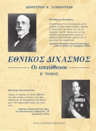 Tον Ιανουάριο του 2021 εξέδωσα το δίτομο βιβλίο μου με θέμα την εθνική καταστροφή του 1922 και με τίτλο, «1922, Οι Υπεύθυνοι», με παραπομπές στις πηγές από όπου άντλησα τις πληροφορίες για τα γεγονότα που περιέγραφα, καθώς και αποσπάσματα πρωτότυπων κειμένων. Μετά ένα χρόνο περίπου, τον Μάιο του 2022 εκδόθηκε, από τον εκδοτικό οίκο «Historical Quest», σε ένα τόμο, το βιβλίο με το ίδιο θέμα, χωρίς παραπομπές και παράθεση αποσπασμάτων πρωτότυπων κειμένων, με τον τίτλο, «1922, Οι Ευθύνες». Τέλος, πρόσφατα, τον Μάρτιο του 2024, ο ίδιος εκδοτικός οίκος εξέδωσε το βιβλίο μου με τον τίτλο, «100 Απαντήσεις για το 1922», όπου σε εκατό καίριες ερωτήσεις, για το πως οδηγηθήκαμε στη μεγάλη εθνική καταστροφή, δίδονται αντίστοιχες τεκμηριωμένες απαντήσεις. Σκοπός του συγγραφέα ήταν, από την αρχή, να δώσει ένα σύντομο ιστορικό κείμενο, για τον μέσο Έλληνα που θα ήθελε μέσα σε ένα τέτοιο κείμενο 270 σελίδων, να κατατοπιστεί για τα γεγονότα της καταστροφής που καθόρισε το αβέβαιο μέλλον του ελληνισμού, αφού προηγουμένως με την έκδοση των δύο άλλων του βιβλίων είχε εξασφαλίσει την επιστημονική τεκμηρίωση των γεγονότων που περιέγραφε. Το παρόν δίτομο βιβλίο, με τον τίτλο «Εθνικός Διχασμός: οι Υπεύθυνοι» έχει ως σκοπό, με τις παραπομπές στις πηγές των αναφερόμενων γεγονότων και την παράθεση αποσπασμάτων πρωτότυπων κειμένων να τεκμηριώσει τα αναφερόμενα στο βιβλίο του σε ένα τόμο, «Εθνικός Διχασμός οι Ευθύνες», για τους αναγνώστες που θα ήθελαν να γίνουν κοινωνοί πρωτοτύπων κειμένων και των ιστορικών πηγών του συγγραφέα. Απομένει η σκοπούμενη έκδοση ενός σύντομου κειμένου σε μορφή απαντήσεως, σε καίρια ερωτήματα πάνω στις αιτίες και τις συνέπειες του Διχασμού που αποτέλεσε το προοίμιο και την αιτία της εθνικής καταστροφής του 1922. Σκοπός του συγγραφέα, με την ανά χείρας έκδοση είναι να δώσει ένα κείμενο με πλήρη τεκμηρίωση των περιγραφόμενων γεγονότων.