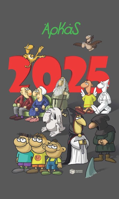 Οι αγαπημένοι ήρωες του Αρκά κατοικούν τις μέρες του ημερολογίου του για το 2025 και συνομιλούν με τον χρόνο που περνά: ο Θανασάκης, η Ρόζα κι η παρέα τους, η Ασημίνα κι ο Ναπολέων, τα έξυπνα πουλιά, οι ένοικοι της Zωής μετά, οι ηρωίδες του Μαλλί με μαλλί και οι κάτοικοι των Επικίνδυνων νερών, ο Προφήτης, αλλά και ο Ισοβίτης, ενώ ο Νώε περιμένει πάντα τη βροχή. Και μας θυμίζουν κάθε μέρα πόσο σπουδαίο αντίδοτο είναι στη ζωή το ευφυές χιούμορ.