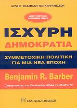 Από την πρώτη έκδοση, πριν από είκοσι τρία χρόνια (1984), το "Ισχυρή Δημοκρατία", του Benjamin R. Barber, έχει μετατραπεί σε ένα από τα κύρια μέτρα βάσει των οποίων κρίνονται η σκέψη και τα κείμενα της πολιτικής επιστήμης. Η "Ισχυρή Δημοκρατία", που ορίζεται ως η συμμετοχή όλων των ανθρώπων σε τουλάχιστον κάποιες πλευρές της αυτοδιακυβέρνησης τουλάχιστον για κάποια διαστήματα, προσφέρει στη φιλελεύθερη κοινωνία έναν νέο τρόπο σκέψης για τη δημοκρατία αλλά και την άσκηση της. Ο Barber υποστηρίζει ότι ο υπερβάλλων φιλελευθερισμός έχει υπονομεύσει τους δημοκρατικούς μας θεσμούς και έχει επιφέρει το σύνολο των κρίσεων εναντίον των οποίων εξακολουθούμε να αγωνιζόμαστε: κυνισμό για την ψήφο, αποξένωση, ιδιωτισμό και την εντεινόμενη παράλυση των δημόσιων θεσμών. Σε έναν νέο πρόλογο, ο συγγραφέας αναφέρεται στις δύο προηγούμενες δεκαετίες και θέτει εκ νέου το επιχείρημα του το οποίο, δυστυχώς, φαίνεται περισσότερο επιτακτικό από ποτέ.
