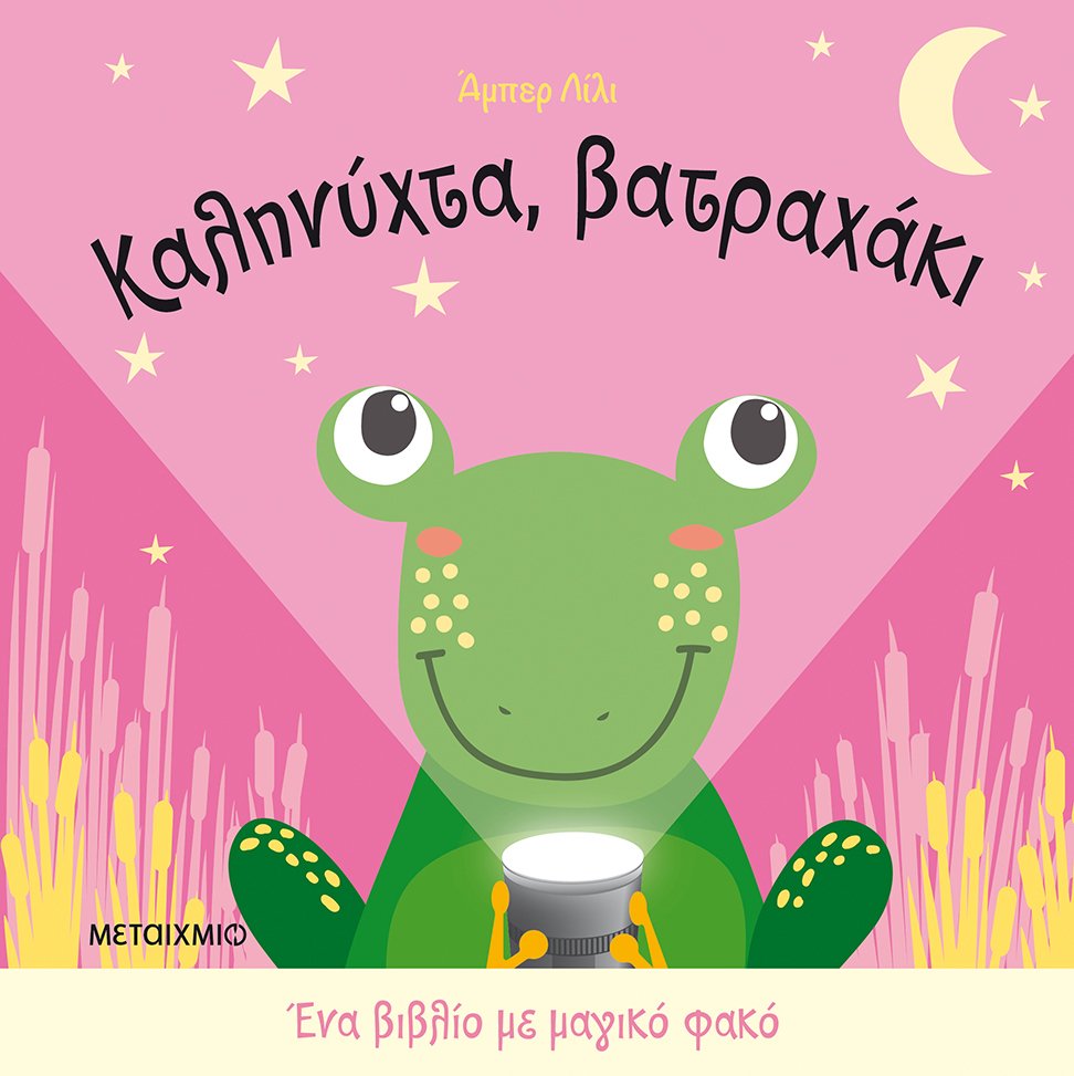 Το βατραχάκι είναι έτοιμo για ύπνο, πρώτα όμως θέλει να πει καληνύχτα στους φίλους του. Μπορείς να το βοηθήσεις να τους βρει όλους; Το παιδί βάζει τον «μαγικό» φακό ανάμεσα στις σελίδες και «φωτίζει» τις εικόνες για να βρει όλα τα ζωάκια.