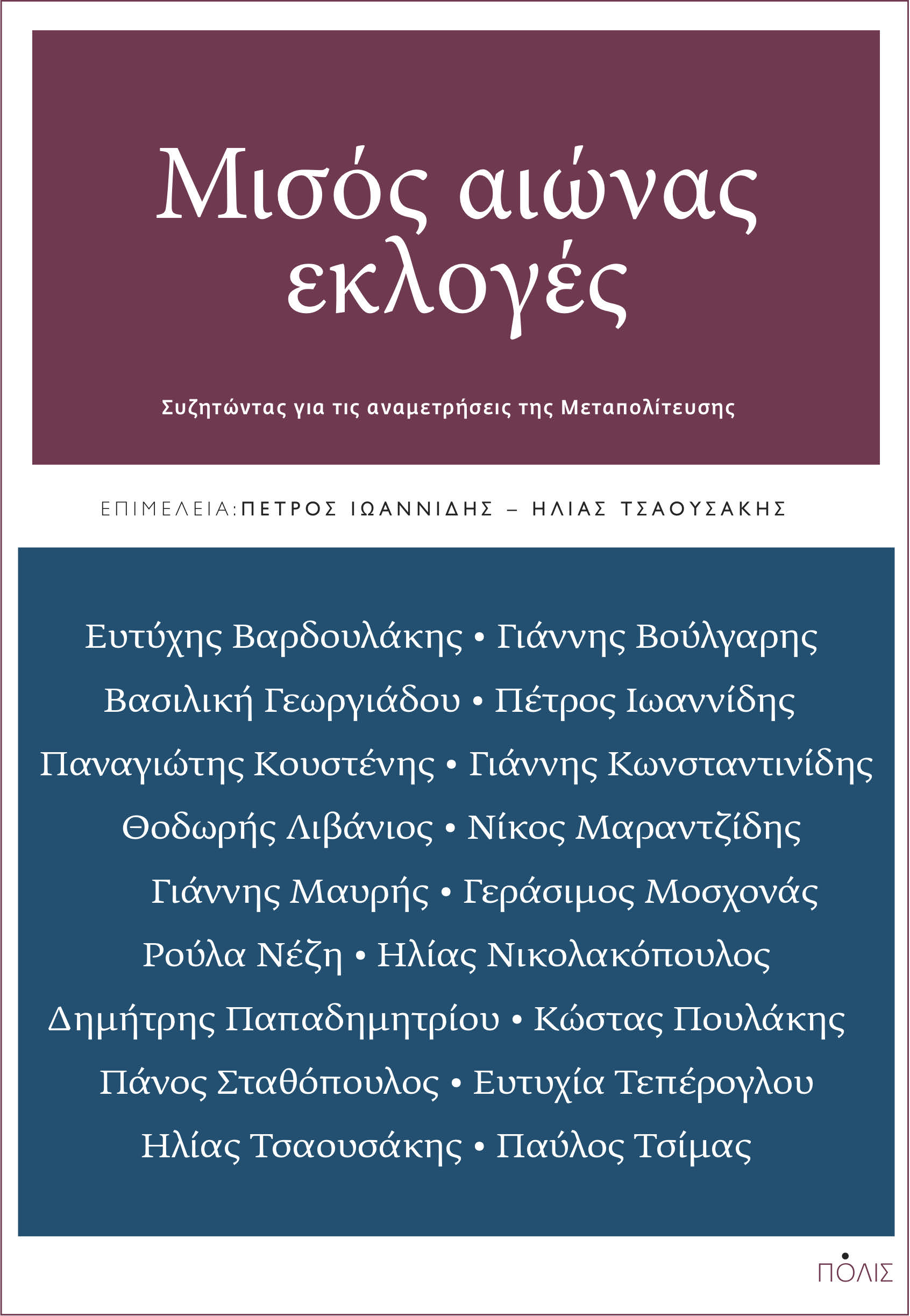 Στο βιβλίο αυτό καταγράφεται μια σημαντική πτυχή της Γ΄ Ελληνικής Δημοκρατίας: όλες οι εθνικές εκλογικές αναμετρήσεις της μεταπολιτευτικής περιόδου 1974-2023. Κεντρικό πυρήνα και βάση του παρόντος τόμου αποτελούν 17 podcasts, συζητήσεις με σημαντικούς συνομιλητές, ακαδημαϊκούς, ειδικούς της πολιτικής επιστήμης, της επικοινωνίας, της ιστορίας και της δημοσιογραφίας, γνώστες της κάθε εκλογικής αναμέτρησης και της αντίστοιχης ιστορικής περιόδου που καθένας και καθεμία πραγματεύεται. Η ιδέα για τη δημιουργία αυτού του ψηφιακού αρχείου συζητήσεων και την επακόλουθη έκδοση του βιβλίου προέκυψε έπειτα από μακρές συζητήσεις των δύο επιμελητών με τον αείμνηστο ομότιμο καθηγητή του Πανεπιστημίου Αθηνών Ηλία Νικολακόπουλο, που ήταν και ο επιστημονικός υπεύθυνος της σειράς. Ο Ηλίας Νικολακόπουλος, βαθύς γνώστης της εκλογικής ιστορίας της χώρας, φιλοδοξούσε μέσα από την καταγραφή των εκλογικών αναμετρήσεων να ιχνηλατήσουμε την πολιτική διαδρομή των τελευταίων 50 ετών, να αναλύσουμε περιεκτικά την κατάσταση που επικρατούσε κάθε περίοδο στα κόμματα, να εντοπίσουμε τα αίτια που οδήγησαν σε νίκες ή ήττες, αλλά και να φωτίσουμε τα πρόσωπα, τους πρωταγωνιστές, τους κερδισμένους και τους ηττημένους αυτών των αναμετρήσεων. Στα κείμενα του παρόντος τόμου αναδεικνύονται οι ιδιαιτερότητες της κάθε εκλογικής μάχης, τα σημεία επαφής, ο ρόλος της διεθνούς κατάστασης, οι ατζέντες των κομμάτων και, φυσικά, η εκλογική γεωγραφία και συμπεριφορά, ο τρόπος με τον οποίο ψήφισαν οι πολίτες. Η περιπλάνηση σε όλες αυτές τις εκλογικές αναμετρήσεις της είναι και ένας τρόπος να προσπαθήσουμε να βρούμε μια απάντηση στο ερώτημα: Τι είναι, τελικά, η Μεταπολίτευση; Είναι, πάνω απ’ όλα, Δημοκρατία, κοινοβουλευτισμός, λύση του Πολιτειακού που ταλάνιζε για δεκαετίες τη χώρα, ευρωπαϊκή πορεία, βελτίωση του βιοτικού επιπέδου. Είναι όμως και πελατειακό κράτος, λαϊκισμός, συντηρητικές συντεχνίες, μεγάλα και μικρά συμφέροντα, πτώχευση και μνημόνια. Μια ιστορία μεγάλων επιτευγμάτων αλλά και μεγάλων αντιφάσεων. Μια περίοδος που αποτιμάται θετικά από τους πολίτες, παρά τη συστηματική, με διαφορετικές αφετηρίες και επιδιώξεις, προσπάθεια συνολικής απαξίωσης της Μεταπολίτευσης και των κατακτήσεών της, η οποία εντάθηκε κατά τη διάρκεια της οικονομικής κρίσης και συνεχίζεται κατά κύματα μέχρι τις μέρες μας. Οι συγγραφείς του τόμου: Ευτύχης Βαρδουλάκης, Γιάννης Βούλγαρης, Βασιλική Γεωργιάδου, Πέτρος Ιωαννίδης, Παναγιώτης Κουστένης, Γιάννης Κωνσταντινίδης, Θοδωρής Λιβάνιος, Νίκος Μαραντζίδης, Γιάννης Μαυρής, Γεράσιμος Μοσχονάς, Ρούλα Νέζη, Ηλίας Νικολακόπουλος, Δημήτρης Παπαδημητρίου, Κώστας Πουλάκης, Πάνος Σταθόπουλος, Ευτυχία Τεπέρογλου, Ηλίας Τσαουσάκης, Παύλος Τσίμας.