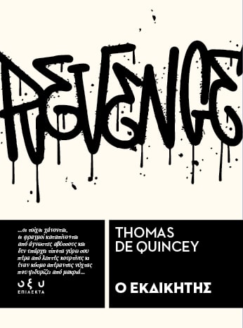 "Ο εκδικητής" ("The Avenger: A Narrative"), η πιο εμπνευσμένη από τις τρεις όλες κι όλες ιστορίες τρόμου που έγραψε ο περίφημος "Άγγλος οπιομανής" Τόμας Ντε Κουίνσυ δημοσιεύθηκε πριν από 168 χρόνια στο λονδρέζικο περιοδικό Blackwood s Edinburgh Magazine και από τότε παραμένει μία από τις σημαντικότερες -και οπωσδήποτε η πρώτη στην ευρωπαϊκή λογοτεχνία- ψυχολογικές σπουδές στην τρομοκρατία....