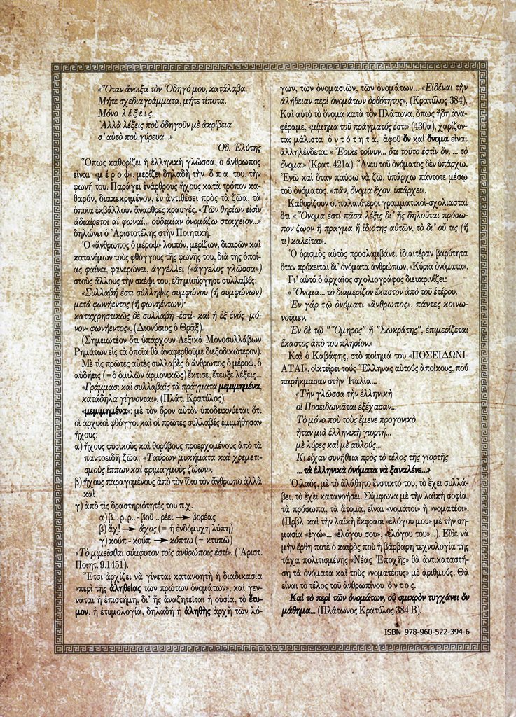 Όπως καθορίζει η ελληνική γλώσσα, ο άνθρωπος είναι "μέροψ", μερίζει δηλαδή την όπα του, την φωνή του. Παράγει έναρθρους ήχους κατά τρόπον καθαρόν, διακεκριμένον, εν αντιθέσει προς τα ζώα, τα οποία εκβάλλουν άναρθρες κραυγές. "Των θηρίων εισίν αδιαίρετοι αι φωναί... ουδεμίαν ονομάζω στοιχείον.." δηλώνει ο Αριστοτέλης στην "Ποιητική". Η Επιστήμη σήμερα μας πληροφορεί ότι ο άνθρωπος είναι εφοδιασμένος με ειδικά κέντρα στον εγκέφαλό του, τα Κέντρα λόγου. Γι' αυτό, ακόμη και οι πιο κουτοί άνθρωποι μαθαίνουν να ομιλούν, ενώ ακόμη και οι πιο έξυπνοι πίθηκοι δεν θα το κατορθώσουν ποτέ. Ήδη ο Ευριπίδης στις "Ικέτιδες" (στ. 201), με τρόπο ποιητικό, το υπαινίσσεται σαφώς: Ο θεός, τον βίοτον (= βίον του ανθρώπου) εκ του πεφυρμένου και θηριώδους, τον διεστάθμησε -τον διευθέτησε-, πρώτον μεν ενθείς σύνεσιν (είναι τα κέντρα λόγου), είτα δε άγγελον (= αγγελιαφόρον) γλώσσαν δους. Και ο Ηράκλειτος: "Πιθήκων ο κάλλιστος, αισχρός ανθρώπων γένει συμβάλλειν". Δηλ. τον κάλλιστον εκ των πιθήκων αν τον παραβάλης προς τον άνθρωπον φαίνεται αισχρός. Ο Γαληνός, ως ιατρός, καταγράφει πως κινείται αυτομάτως η γλώσσα προκειμένου να επαναλάβη τους ήχους, τις λέξεις, που το νήπιον ακούει: "Εάν παιδίω διετεί δείξας άρτον ονομάσης το όνομα "άρτος" άμα τω δείξαι, και ποιήσης ούτω δις και τρις, ότι του δεικνυμένου σώματος η "άρτος" φωνή σημείον εστίν, εννόησε το παιδίον, και αυτό μιμησάμενον φθέγγεται, μη διδαχθέν πως χρη κινήσαι την γλώσσαν." Ο "άνθρωπος ο μέροψ" λοιπόν, μερίζων, διαιρών και κατανέμων τους φθόγγους της φωνής του, δια της οποίας φαίνει, φανερώνει, αγγέλλει ("άγγελος γλώσσα") στους άλλους την σκέψι του, εδημιούργησε συλλαβές: "Συλλαβή εστί σύλληψις συμφώνου (ή συμφώνων) μετά φωνήεντος (ή φωνηέντων)· καταχρηστικώς δε συλλαβή -εστί- και η εξ ενός -μόνον- φωνήεντος." (Διονύσιος ο Θραξ) [...] (Από την παρουσίαση της έκδοσης) * * Περιεχόμενα * Εν είδει Προοιμίου ΕΙΣΑΓΩΓΗ Μέρη του λόγου Δει επίστασθαι το είδος τιθέναι εις τα γράμματα και τας συλλαβάς Περί του σχήματος και της σημασίας των γραμμάτων του Ελληνικού Αλφαβήτου Εναλλαγή γραμμάτων και προφοράς από διάλεκτο σε διάλεκτο Ο της λέξεως ΑΡΙΘΜΟΣ ρυθμός εστί Γράμμασι και ΣΥΛΛΑΒΑΙΣ τα πράγματα μεμιμημένα Μονοσύλλαβα ρήματα Προθέματα, Προσφύματα Προθέσεις Σύνδεσμοι Επιρρήματα Αντωνυμίαι Καταλήξεις Τα ρήματα ειμί και έχω Η προς το ακρότατον της Καλλιφωνίας διαπλασθείσα ελληνική γλώσσα Η των γραμμάτων φύσις και η των συλλαβών δύναμις Τω φίλτατον φώνημα Η Ελληνική γλώσσα, ιερόν κτήμα Καλλιλεξιλογίου δείγμα Λεξιλόγιον "γλώσσης" Σχετικά με λόγον και ομιλίαν ρήματα Λεξιλόγιον: "σοφός"-"άσοφος" Περί αληθείας και ψεύδους Περί φλυαρίας-Λεξιλόγιον Περί κακολογίας-Λεξιλόγιον Τα Ελληνικά... Ίλιγγος λέξεων ΚΟΣΜΟΣ εστί σύστημα εξ ουρανού και γης Της αλός και του αλίου Εκ της θαλάττης τον ήλιον Κοινόν Λεξιλόγιον αλός και αλίου άλιον λεξιλόγιον θάλαττα, θάλαττα... ΑΙΓΑΙΟΝ ΠΕΛΑΓΟΣ Γένος ναίας τέχνας άλς, λάς, λαός Επιλογισμός - θάλασσα, η κατ' εξοχήν των Ελλήνων πατρίς Ιστιοφόρα, εμπορικά, πολεμικά Ονόματα θαλάσσης και θαλάσσιοι ήχοι Πελασγοί Πολύπλαγκτοι Το κοινόν Λεξιλόγιον θαλάσσης και αιθέρων Ελληνική Αεροπορία - αιέν υψικρατείν Περί αέρων, υδάτων, τόπων. - Γη Τα υπό την γήν, Τα επί της γης Άριστον μεν ύδωρ Αήρ, Άνεμοι Τα υπέρ την γην-Ουρανός Αστέρες Σελήνη Πρώτιστα Χάος εγένετο Χρόνος μετ' ουρανού γέγονεν Σκότος, φως, χρώματα Πολλά τα δεινά κουδέν ανθρ