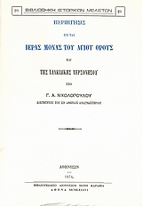 Ο Γ. Νικολόπουλος, διευθυντής του αναγνωστηρίου του Συλλόγου προς Διάδοσιν των Ελληνικών Γραμμάτων στην Αθήνα, προσφέρει έναν εύχρηστο περιηγητικό οδηγό για τον κοινό επισκέπτη των σημαντικότερων μονών της Ιεράς Κοινότητας του Αθω: Εσφιγμένου, Βατοπαιδίου, Κουτλουμουσίου, Ιβήρων, Ξηροποτάμου, Αγίου Παντελεήμονος και της ρωσικής σκήτης του Αγίου Ανδρέου. Ο συγγραφέας περιγράφει με συντομία την αρχιτεκτονική, τον διάκοσμο, το ιστορικό ίδρυσης, τις αποστάσεις μεταξύ των μοναστηριών, το φυσικό τοπίο, το τυπικό και τις καθημερινές συνήθειες των Αγιορειτών μοναχών. Επίσης, παρέχει στοιχεία για τα μετόχια των μονών. Η ιστορική αξία του βιβλίου έγκειται κυρίως στο δεύτερο μέρος του, το "μέρος πολιτικόν", όπου αναπτύσσεται η προσπάθεια των Ρώσων να εποικίσουν το Αγιο Όρος με Ρώσους μοναχούς με σκοπό τον "εξανδραποδισμόν του ελληνισμού". Η μεγαλύτερη σλαβική κοινότητα, πέραν της Μονής Παντελεήμονος, όπου μόναζαν τότε 400 Ρώσοι, ήταν η σκήτη του Αγίου Ανδρέου, όπου εγκαταβιούσαν 200 Ρώσοι μοναχοί. Ο συγγραφέας καυτηριάζει την αδιαφορία των πολιτικών της Ελλάδας και τούς καλεί σε εγρήγορση, "καθόσον ο αστήρ του Ελληνισμού δεν έσβησεν".