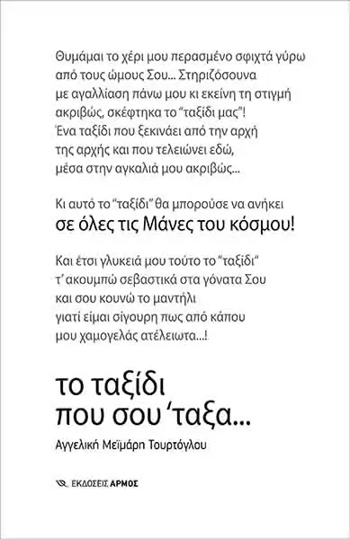 Θυμάμαι το χέρι μου περασμένο σφιχτά γύρω από τους ώμους Σου… Στηριζόσουνα με αγαλλίαση πάνω μου κι εκείνη τη στιγμή ακριβώς, σκέφτηκα το “ταξίδι” μας! Ένα ταξίδι που ξεκινάει από την αρχή της αρχής και που τελειώνει εδώ, μέσα στην αγκαλιά μου ακριβώς…