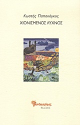 Ο "Χιονισμένος λύχνος" ολοκληρώθηκε στο τέλος του 1990 και κυκλοφόρησε πρώτα στα σουηδικά το 2006. Το βιβλίο χωρίζεται σε τέσσερις ενότητες ανά είκοσι ποιήματα στην πρώτη και την τρίτη, δεκαοχτώ τρίστιχα στη δεύτερη, ενώ στην τελευταία περιλαμβάνεται το ποίημα "Ανοιξιάτικος θρήνος για τον Ούλοφ Πάλμε" που γράφτηκε με αφορμή τη δολοφονία του θρυλικού Σουηδού πρωθυπουργού το 1986. Στον "Χιονισμένο λύχνο" ο ποιητής συνομιλεί με την ιστορία: "Οι ασύρματοι στον κήπο απ τα τριζόνια/σφυροκοπούν ειδήσεις οργισμένες/ απ τον εμφύλιο πόλεμο των στιγμών / που ναι αιώνιος". Σταχυολογεί μνήμες απ τον γενέθλιο τόπο του, όπως στο ποίημα "Μεγάλη Παρασκευή στην Πίνδο", ή αλλού, επιστρατεύει την ερμηνευτική των ονείρων ως απολογισμό, κάθαρση και ενδοσκόπηση τετελεσμένων: "Πρόχειρο ρούχα η κάθε μέρα, τα βράδια/ την πετάω απ τις πλάτες μου/ και χώνομαι στην παλιά μου πιτζάμα.// Πάνω της τα όνειρα μου μπαλώματα/ τρέμουν καθώς με τρέχει μες στη ζούγκλα/ η λεοπάρδαλη του ύπνου". Συμπυκνώνει το οδοιπορικό του προσωπικού του βίου, ενώ παράλληλα αναπλάθει το δράμα της κατοχικής γενιάς του: "πλανήθηκα στα βουνά χρόνια/μα πουθενά δεν έτυχα/ ψηλότερη κορφή απ την Παρηγοριά.//Στο διάβα μου δυο μαυροπούλια/ στον ουρανό: ο Έρωτας και η Λευτεριά/ ανέμιζαν τις φτερούγες τους/ να δροσίσουν το πρόσωπο του κόσμου..." Είναι πολλά τα ποιήματα θρήνοι ζωής στον "Χιονισμένο λύχνο". Όχι με τη μεμψίμοιρη ματιά, αλλά με τη διαπιστωτική πράξη τού κάθε ανθρώπου που κρύβει μέσα του βαθιά κι αναπόφευκτα τον πόνο, τη χαρά, το θαύμα ή τη λύπη.