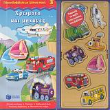 Μαθαίνω τα χρώματα και τα οχήματα με μηχανές. Στα παιδιά αρέσει πολύ οτιδήποτε έχει σχέση με μηχανές. Συμπληρώνοντας τις εικόνες του βιβλίου με τα ξύλινα κομμάτια παζλ, θα μάθουν τα χρώματα και τα ονόματα των διαφόρων οχημάτων με μηχανή, ενώ, παράλληλα, θα αναπτύξουν τη σκέψη και τις κινητικές τους δεξιότητες. - Φαντασία και μνήμη - Γλώσσα - Καθημερινή ζωή - Κατεύθυνση στο χώρο και οπτική αντίληψη - Κινητικές δεξιότητες